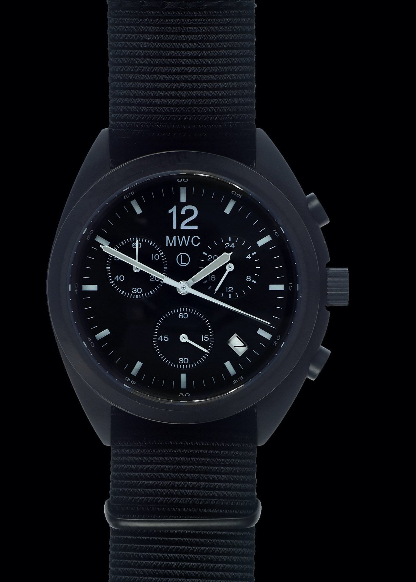 MWC Mechanical/Quartz Hybrid NATO Pattern Militärisch Pilots Chronograph is eine militärische Fliegeruhr die handaufziehendes Uhrwerk kombiniert mit gehärtetem Mineralglas. Sodass is dieses Modell geeignet für zowel actief Feldeinsatz als das tägliche Tragen. Darüber hinaus trekt diese Uhr de aandacht von jeden, der Qualität en Authentizität waardeert.