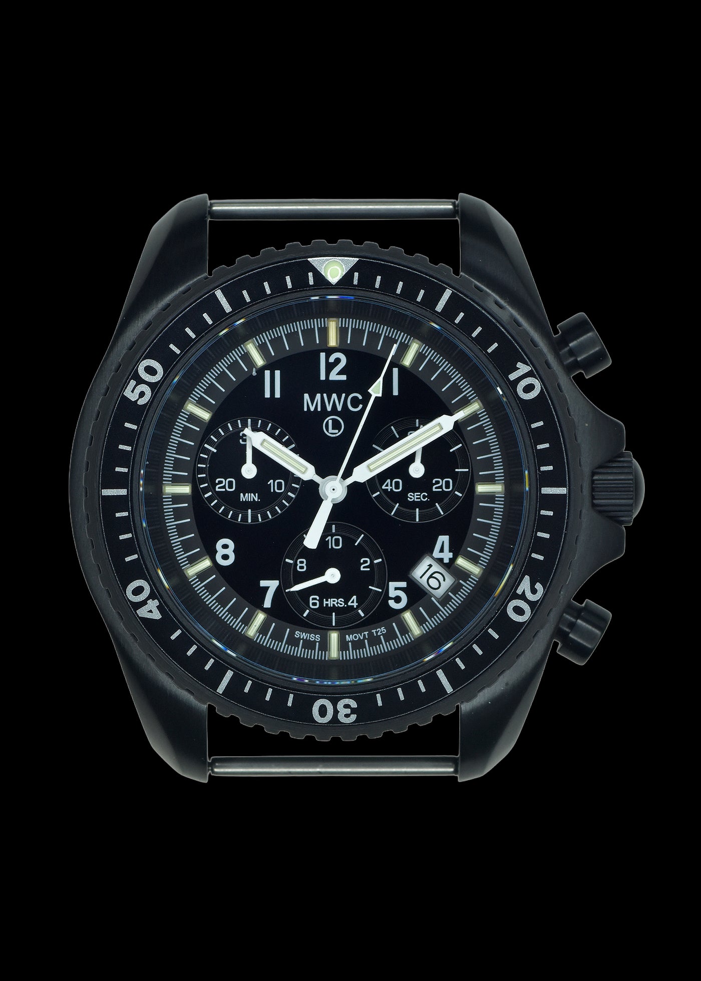 MWC NATO PatternBlack PVD Steel Militärisch Pilots Chronograph with is eine militärische Fliegeruhr die Chronograph Uhrwerk kombiniert mit gehärtetem Mineralglas. Dientengevolge is dieses Modell geeignet für zowel actief Feldeinsatz als das tägliche Tragen. Waardoor trekt diese Uhr de aandacht von jeden, der Qualität en Authentizität waardeert.