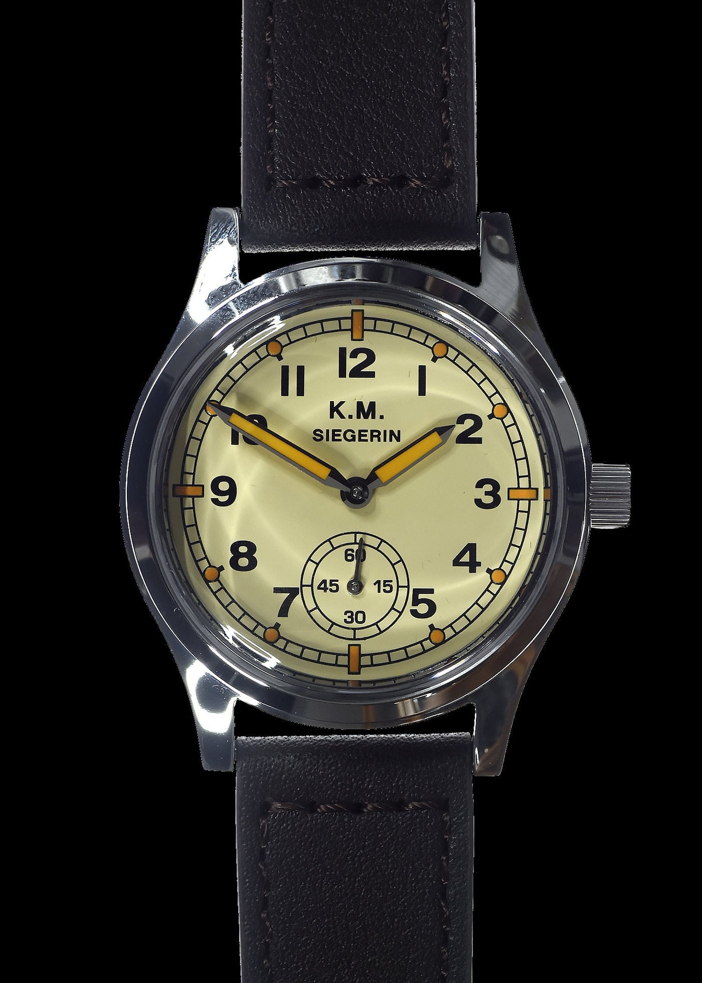 Die Siegerin Kriegsmarine (German Navy) WW2 ist mit automatischem Uhrwerk und gehärtetem Mineralglas ausgestattet und wasserdicht bis 100 Meter. Damit ist sie eine zuverlässige Wahl für Militärangehörige, Abenteurer und Uhrenliebhaber.